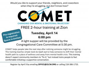 The training will be Tuesday, April 14, at 6:00 pm at Zion Lutheran Church. At 5:30 pm, a light supper will be provided by the Congregational Care Committee. There are limited seats at this training. To secure your spot email the church office, office@zlcw.org, with your name, phone number, and email or call 218-386-1733. Pre-registration is required by April 9.